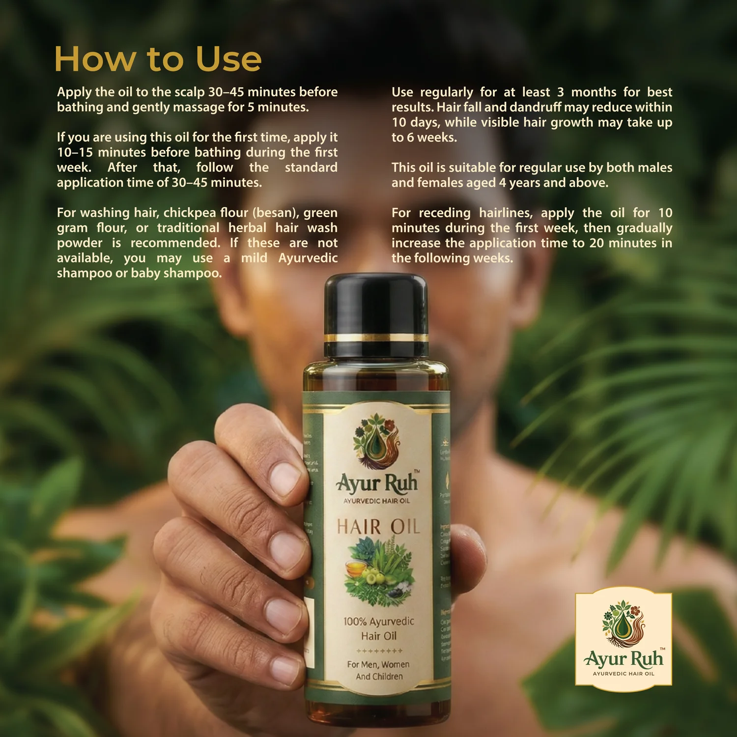 Apply it on the scalp 30 minutes before showering and massage for 5 minutes. For first-time users, oil can be applied 10 minutes before bathing for the first week. After a week you can follow the above time. Ayur ruh hair shampoo powder are best for washing hair. It should be used for at least 3 months and possibly more. Hair oil can be used regularly for boys and girls from the age of 6 without any age limit. Hair loss and dandruff disappear within 10 days. t takes up to 1.5 months for Visible hair growth.